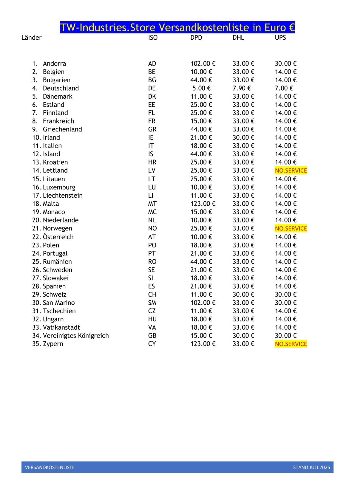Die Versandkostenpreise entnehmen Sie bitte der Vorliegenden Versandkostenlisten in unserem Webshop: TW-Industries.store.